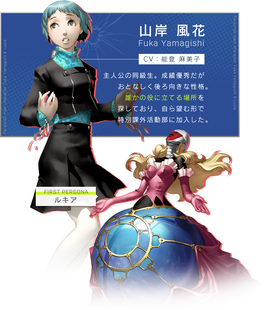 『ペルソナ3』より、AniArt キャラメモボードの登場です。 山岸 風花を新たなタッチで魅力的に表現しました。 ゲーム画面のテキストエリアをイメージしたデザインに仕上げました。. 映画世界へ、ようこそ―― ペルソナシリーズrpg最新作「ペルソナq2 ニュー シネマ ラビリンス」(pq2) 好評発売中!. 『ペルソナ3 ダンシング・ムーンナイト』、『ペルソナ5 ダンシング・スターナイト』風花と双葉のキャラクターvを公開 10.