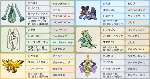 メガヤスゴドラ サザンボスゴですなwww グロスガルドと違い、格闘やテテフ等に弱くなりますが、ヤザンを起点にしようとするミミッキュに後投げできますぞwww メガヤキノオー ノーザングロスまたはノーザンガルドの一員ですなwww. ピカチュウでサポートしながらテッカグヤでボディパージ ↓ ピカチュウが倒れたらテッカグヤの撃ち落とすガブリアスの地震で一掃。 その他 避雷針猫竜舞とか。辛い水タイプに打点が持てるので↓より良い気がする。 避雷針ならこっちでも同じ。. 『サザンドラ』の育成論・調整。 (シールド) ナットレイ モロバレル ポリゴン2 ラッキー ドヒドイデ グライオン テッカグヤ hd:c172ロトムの目覚めるパワー氷2耐え(dl対策) s:準速ミミッキュ+2(最速デンジュモク抜き).
